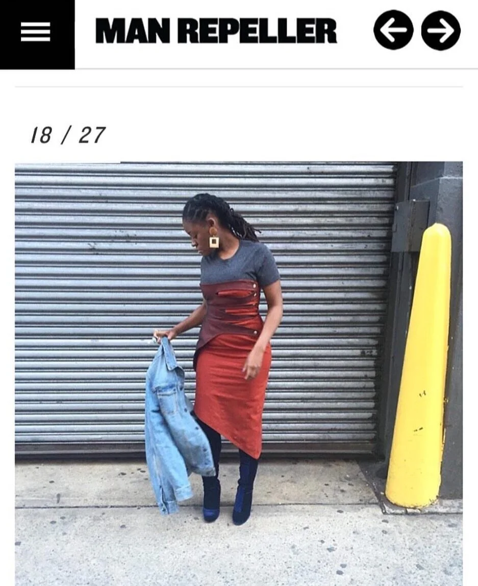 Stylist Vanessa Lundy featured in ManRepeller during NYFW wearing BrandNUbia